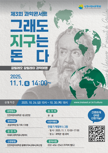 인천시설공단 인천어린이과학관은 오는 1일 오후 2시에 갈릴레오 갈릴레이의 삶과 과학적 업적을 탐구하는 과학강연 프로그램인 제3회 과학콘서트 “그래도 지구는 돈다-갈릴레오 갈릴레이 과학여행”을 개최한다.