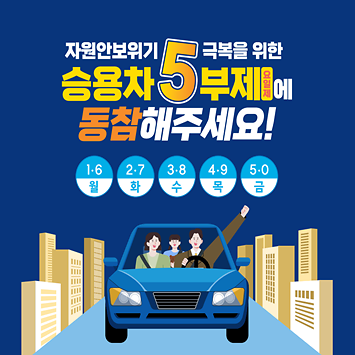 자원안보 위기 ‘경계’ 발령으로 에너지 절감과 수요 관리를 위해 ‘승용차 5부제(요일제)’를 시행하오니 많은 협조를 부탁드립니다.