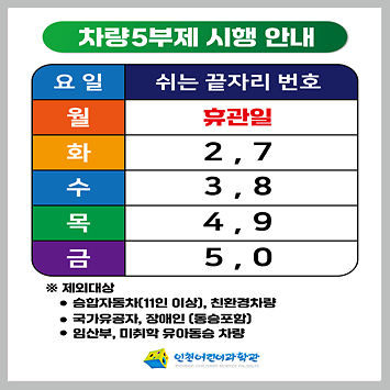 ※ 차량 번호판 끝자리 숫자에 따라 요일별 주차장 출입 제한