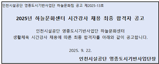 하늘문화센터 2025년 시간, 위탁 강사 채용 최종 합격자 공고(2025-13)