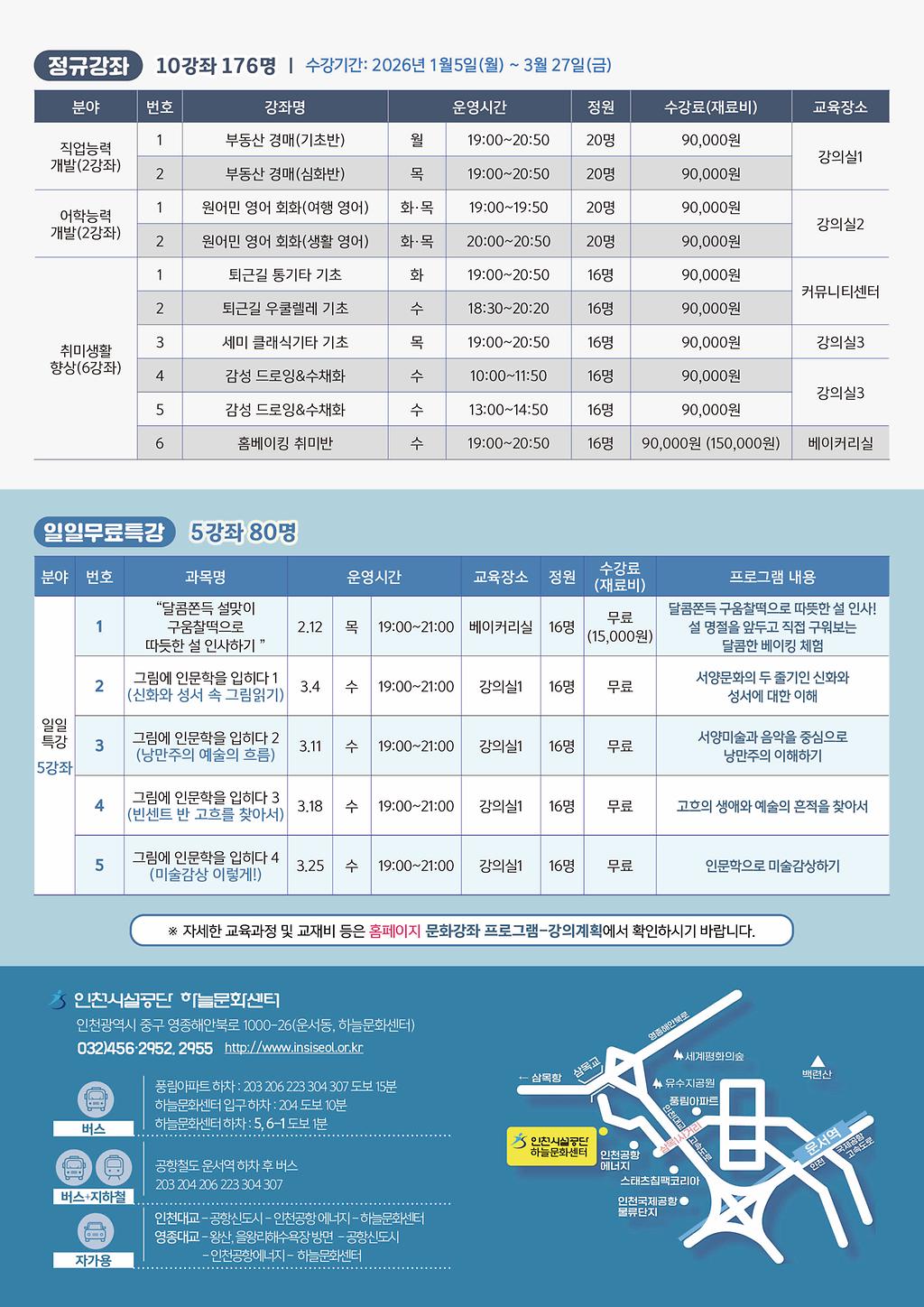 - 휴 강 일: 1.1(목) 신정, 2.16(월)~2.18(수) 설연휴, 3.2(월) 삼일절대체휴무