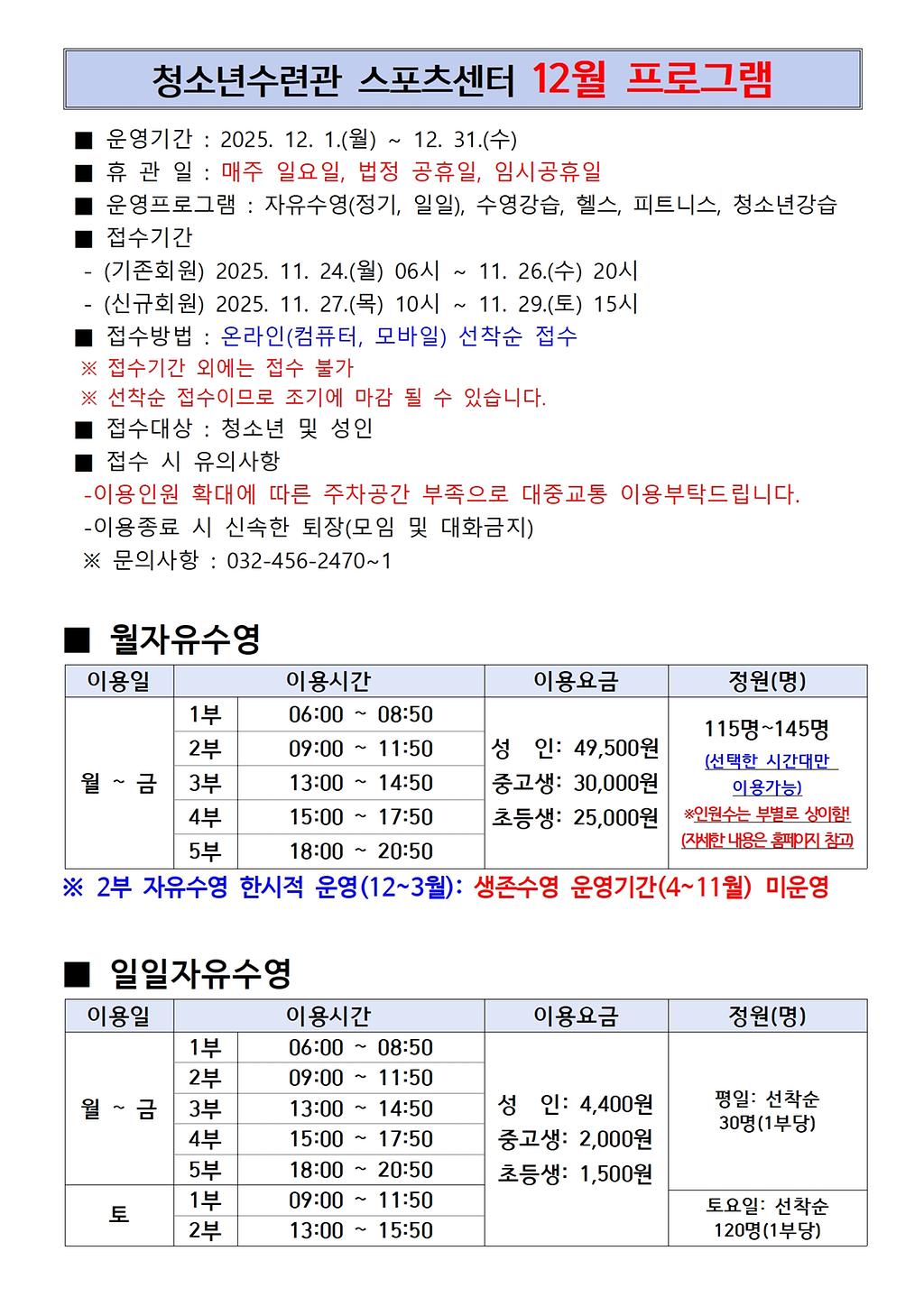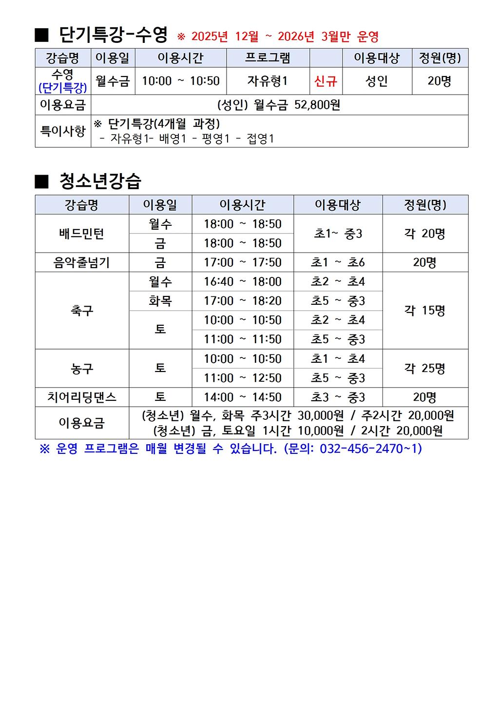 [모집] 2025년 12월 청소년수련관 생활체육 프로그램 안내