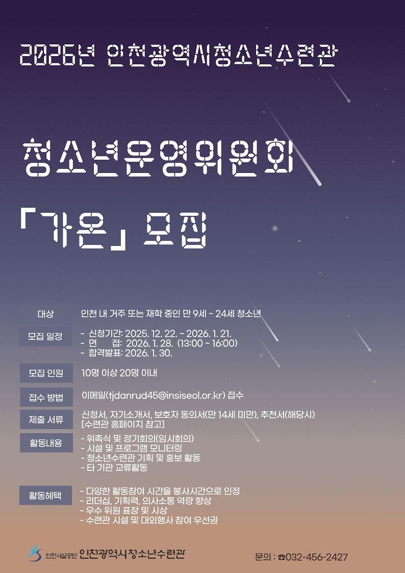 인천광역시청소년수련관에서 23기 청소년운영위원회를 모집합니다.