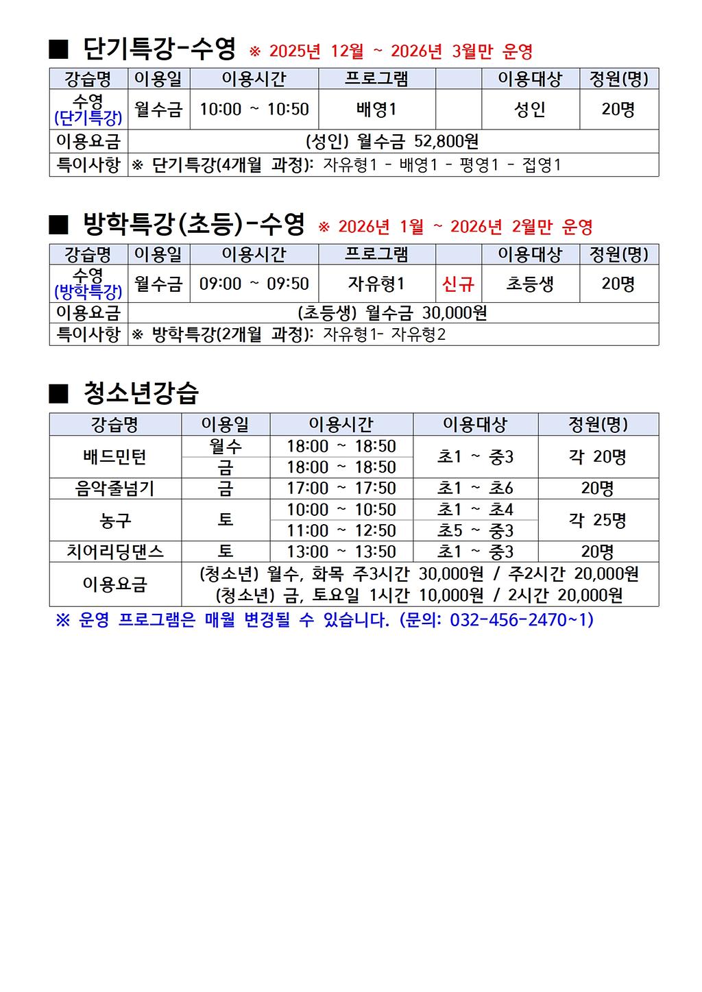 [모집] 2026년 1월 청소년수련관 생활체육 프로그램 안내