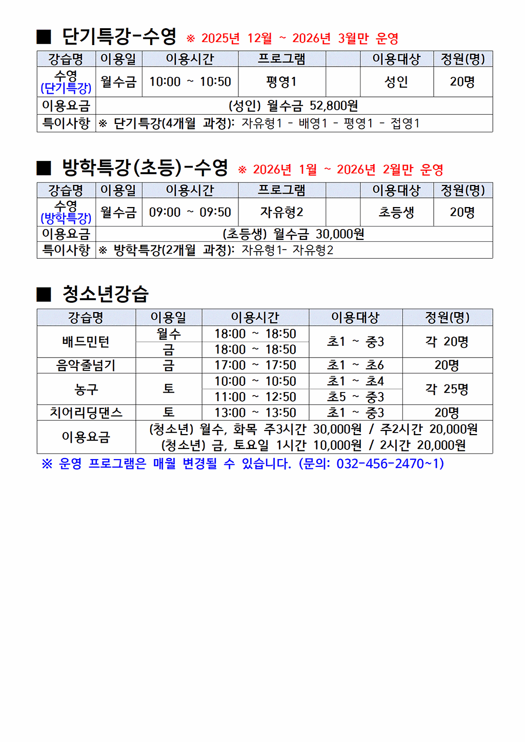 [모집] 2026년 2월 청소년수련관 생활체육 프로그램 안내