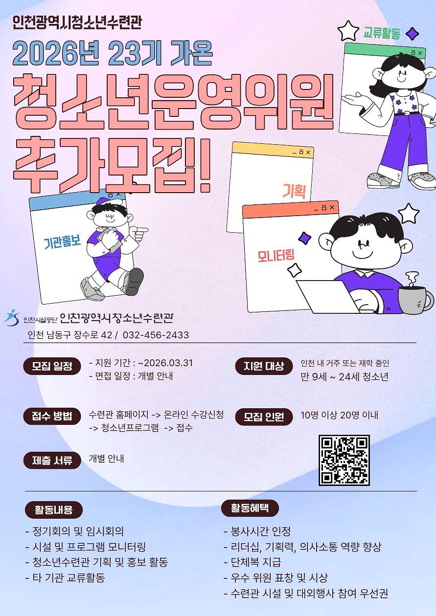 접수문의: 청소년사업팀 담당자 김경민 (032-456-2433)