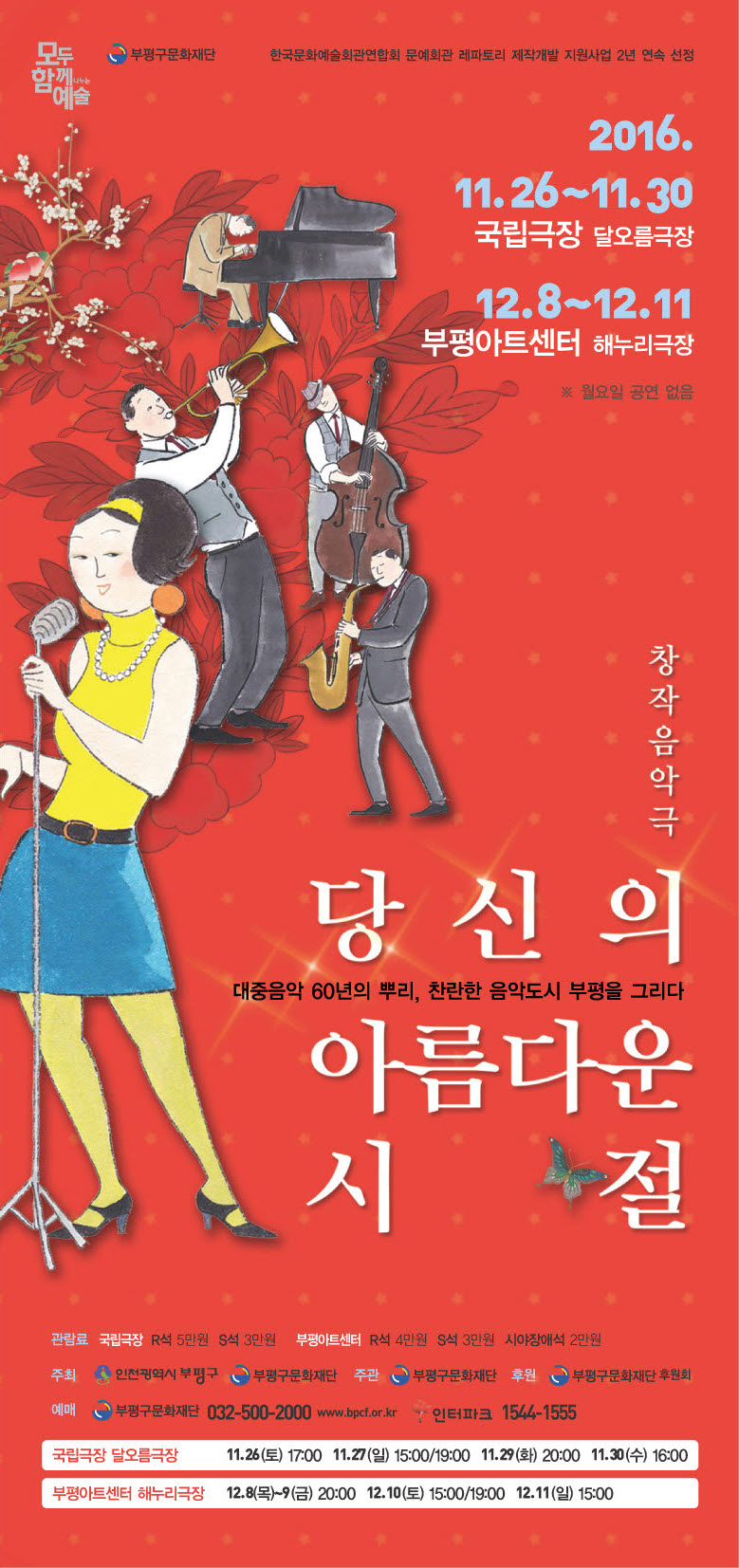 대중음악의 성장을 이끌었던 당시 인천 음악인들의 뜨거운 열정과 치열했던 삶을 공연 콘텐츠로 만들어낸 음악극! 한국 대중음악 60년의 뿌리 부평을 배경으로 시대와 세대를 아우르는 창작음악극 <당신의 아름다운 시절>이 오는 11/26(토)~30(수) 국립극장과 12/8(목)~11(일) 부평아트센터에서 선보입니다. 주인공 용생 역에 정욱진, 박화홍 배우가 캐스팅 되어 더욱 기대를 모으고 있는데요. 2016 더욱 탄탄한 스토리와 감동으로 돌아온 <당신의 아름다운 시절> 기대해주세요.