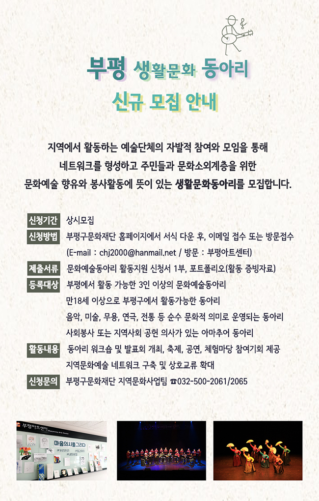 신청문의 부평구문화재단 지역문화사업팀 ☎032-500-2061/2065