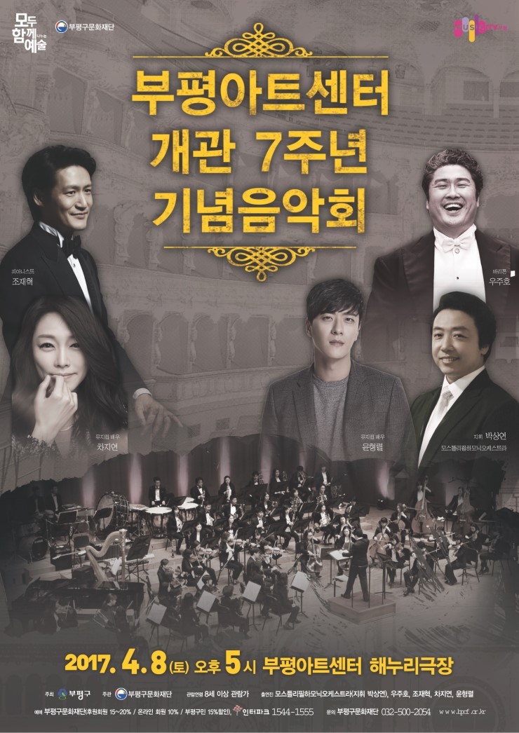 부평아트센터 개관 7주년 기념음악회에서는 클래식 대중화의 선두주자 모스틀리 필하모닉 오케스트라와 함께 합니다. 협연은 ‘대한민국 오페라 대상’에서 주역상에 빛나는 국내 최고의 바리톤 우주호, 감성과 지성을 겸비, 뛰어난 테크닉과 구성력, 통찰력과 섬세함으로 매력적인 연주 활동을 하고 있는 피아니스트 조재혁, 뮤지컬계의 보석같은 디바 <몬테크리스토백작> <아이다> <레베카> <위키드> 등에서 폭팔적인 가창력과 카리스마로 관객을 압도하는 차지연, 뮤지컬 <노트르담드 빠리> <모차르트> <햄릿> 등에서 깊은 울림의 목소리를 전했던 뮤지컬 스타 윤형렬 등 국내 최고의 아티스트들이 전하는 환상의 하모니를 펼칠 예정입니다.