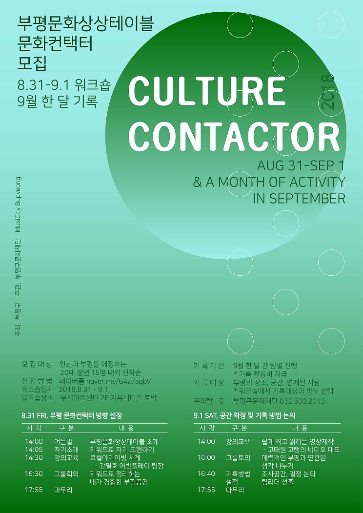 부평의 장소와 공간을 기록하는 2018 부평문화상상테이블 문화컨텍터를 모집합니다. 문화컨텍터는 매력 있는 부평의 장소와 공간을 다른 사람들이 이해하고 접촉, 접근하기 쉽도록 자신만의 관점으로 풀어낸 콘텐츠로 기록한다는 의미가 담겼습니다.