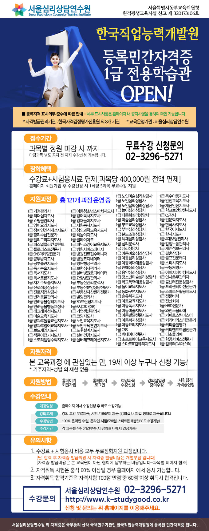 서울심리상담연수원에서는 직업능력개발 자격증 교육 대상자 분들께 교육비전액과