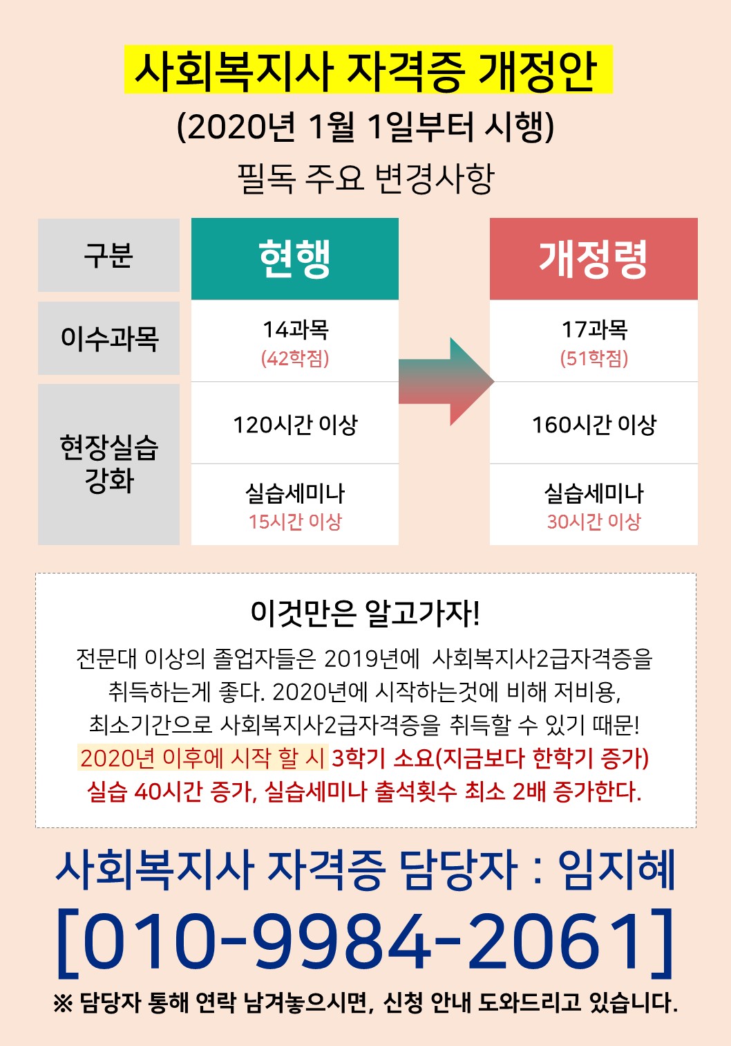 특히 이번 2020년도가 되면 사회복지사 법이 개정됨에 따라 전문대졸이상일 경우 과목수가 14과목에서 17과목으로 늘어나며