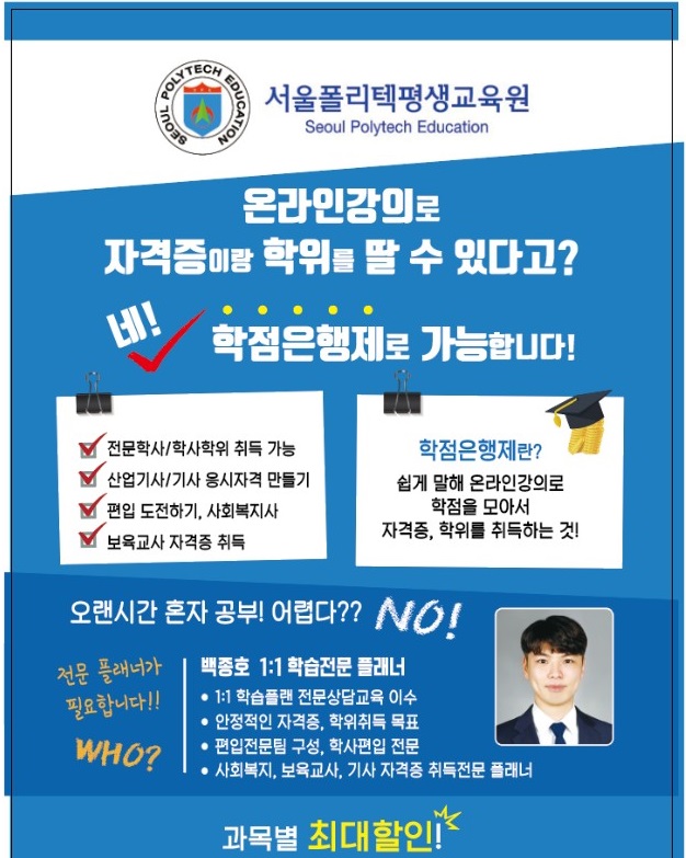 오프라인 수업에 비해 시간적, 비용적으로 훨씬 더 절감되는 효과를 보실 수 있고 학.점.은.행.제 자체 학.점이수 방법이 시간제수업, 독학사, 자.격.증, 전.적.대 학.점등 있다보니 단기간 학위 취득이 가능합니다.