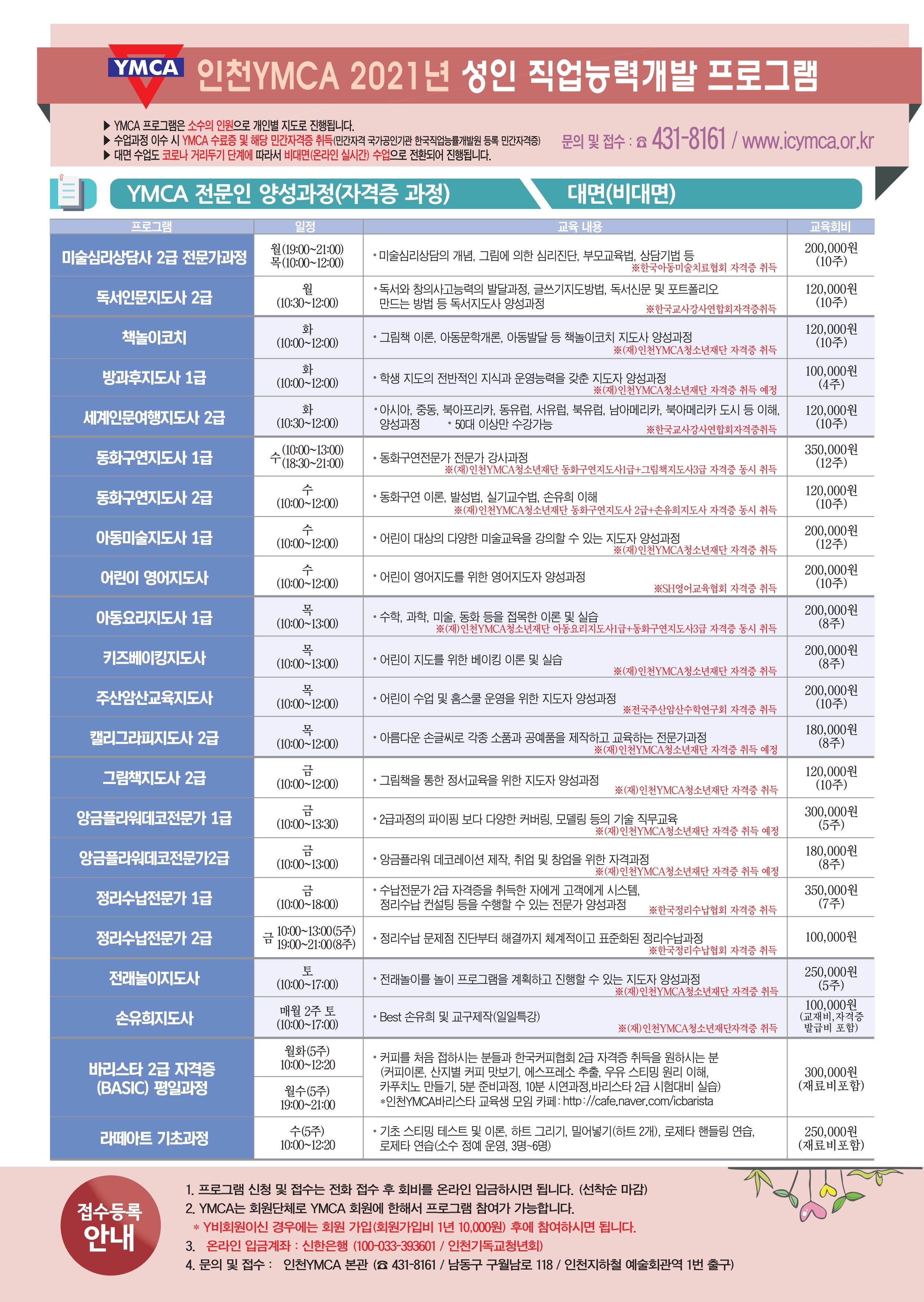 * 문의 및 접수 : 032)431-8161(사회교육부) www.icymca.or.kr