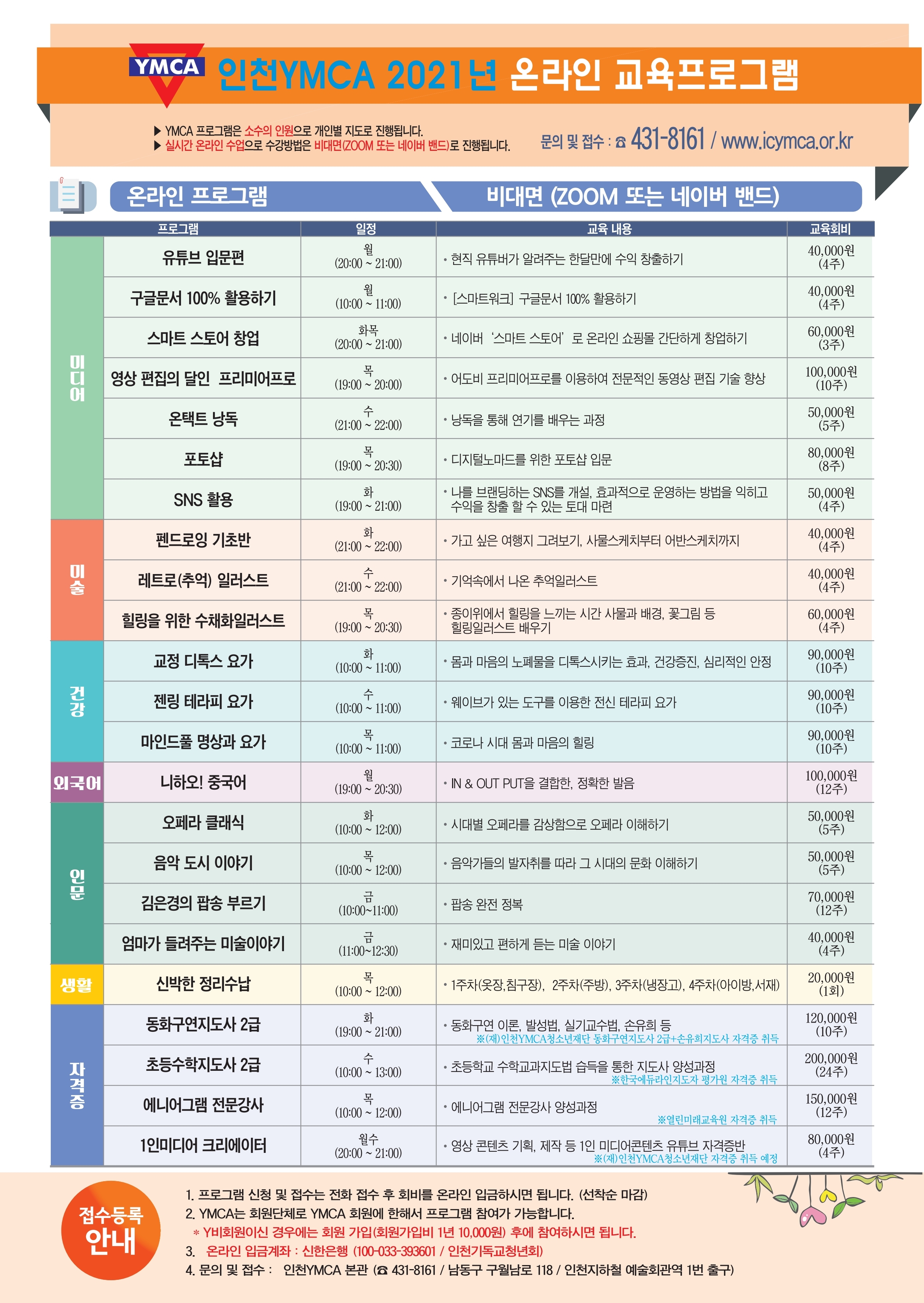 * 문의 및 접수 : 032)431-8161(사회교육부) www.icymca.or.kr