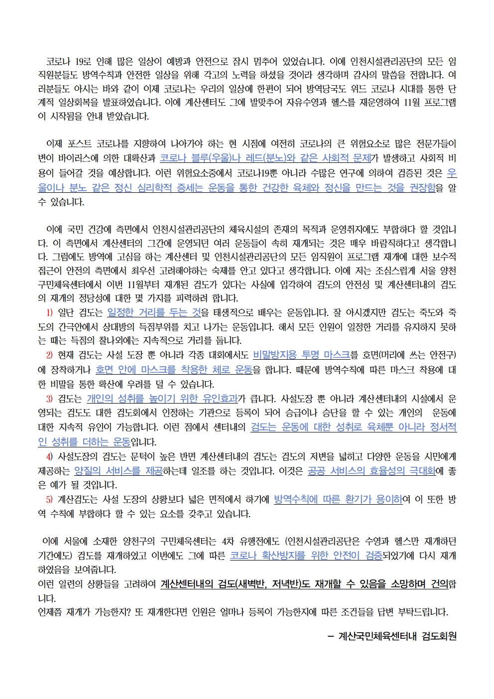 이에 국민 건강에 측면에서 인천시설관리공단의 체육시설의 존재의 목적과 운영취지에도 부합하다 할 것입니다. 이 측면에서 계산센터의 그간에 운영되던 여러 운동들이 속히 재개되는 것은 매우 바람직하다고 생각합니다. 그럼에도 방역에 고심을 하는 계산센터 및 인천시설관리공단의 모든 임직원이 프로그램 재개에 대한 보수적 접근이 안전의 측면에서 최우선 고려해야하는 숙제를 안고 있다고 생각합니다. 이에 저는 조심스럽게 서울 양천구민체육센터에서 이번 11월부터 재개된 검도가 있다는 사실에 입각하여 검도의 안전성 및 계산센터내의 검도의 재개의 정당성에 대한 몇 가지를 피력하려 합니다.