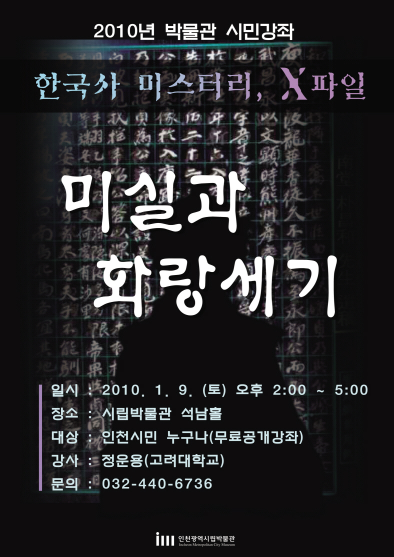 인천광역시립박물관은 우리나라 문화에 대한 시민의 관심과 이해를 돕기 위해 “2010년 박물관 시민강좌”를 운영합니다. 금년 시민강좌는 “한국사 미스터리, X파일”을 주제로 한국의 역사․문화와 관련하여 일반시민들이 흥미로워하고 궁금해 하는 여러 가지 논쟁과 미스터리를 주제로 강의가 진행됩니다. 각 주제에 적합한 대표적인 명사들을 초빙하여 특강형식으로 매월 1회(첫째 주 토요일)운영할 예정입니다.