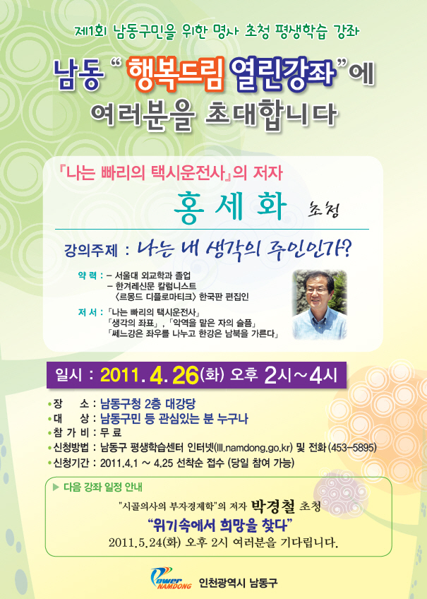 [강좌초대] 나는빠리의택시운전사의 저자 홍세화 강연 - 4/26(화) 남동구청 2층 대강당
