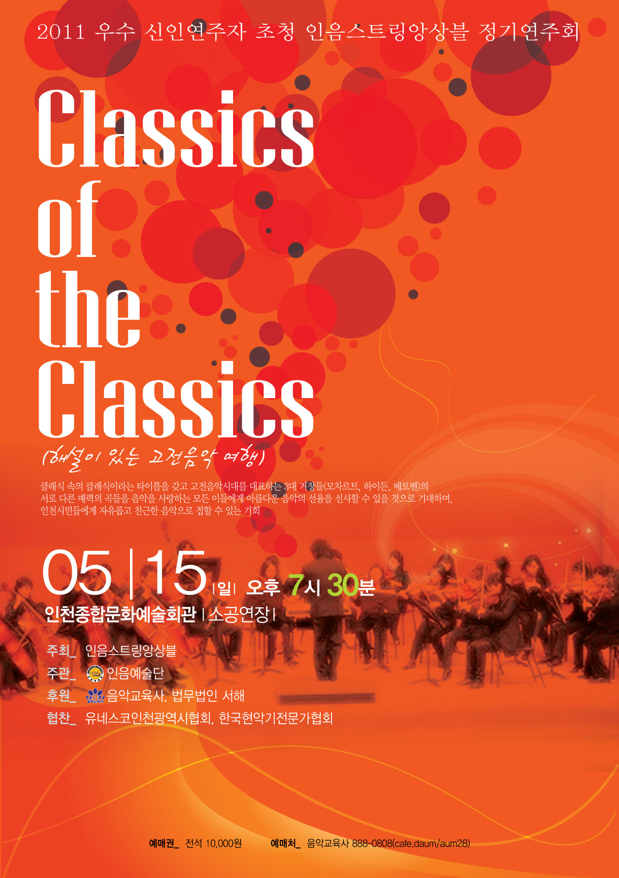 체입니다. 2007년 다시 재정비되어 더욱 활발한 연주활동을 펼치고 있는 인음스트링앙상블의 이번 “classics of the classics”의 연주에서는 고전시대의 대표 음악가 모차르트, 하이든, 베토벤의 아름다운 선율을 들으실 수 있는 절호의 기회가 될 것입니다.