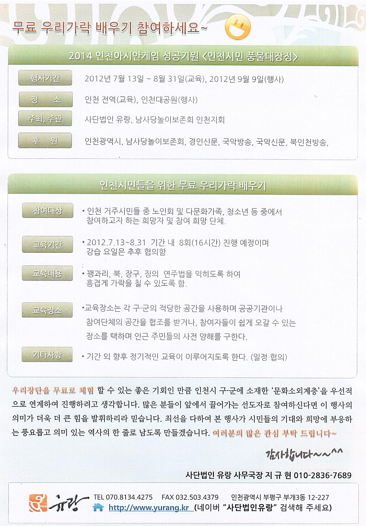 우리장단을 무료로 체험 할 수 있는 좋은 기회인 만큼 인천시 구,군에 소재한 ‘문화소외계층’을 우선적으로 연계하여 진행하려고 합니다. 많은 분들이 앞에서 끌어가는 선도자로 참여하신다면 이 행사의 의미가 더욱 더 큰 힘을 발휘하리라 믿습니다. 최섢을 다하서 본 행사가 시민들의 기대와 희망에 부응하는 풍요롭고 의미 있는 역사의 한 줄로 남도록 만들겠습니다. 여러분의 많은 참여와 관심 부탁드립니다.
