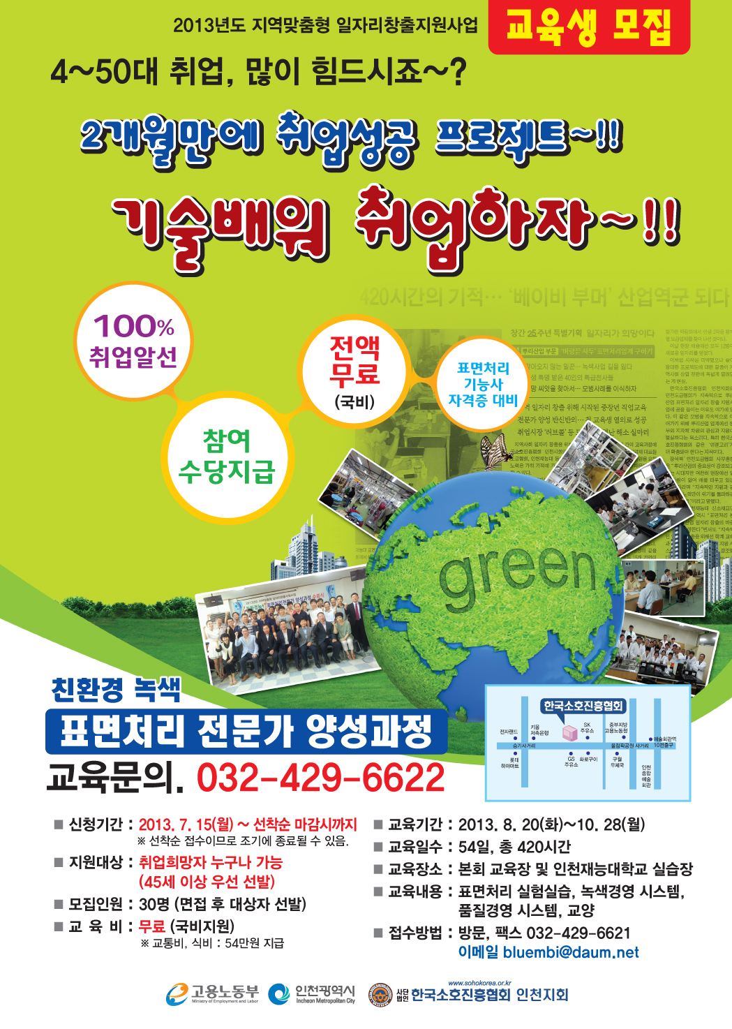 (사)한국소호진흥협회 인천지회는 국비지원「친환경 녹색 표면처리 전문가 양성과정」교육생을 모집합니다. 인천광역시와 고용노동부가 공동 지원하는 이번 교육은 인천의 뿌리산업인 표면처리기업의 경쟁력 강화를 위해 표면처리전문인력 양성하여 지역기업에 취업을 연계함으로 기업의 구인애로완화와 시민의 취업을 지원하고자 계획되었습니다. 베이비부머 세대를 우대하는 이번교육에 인천시민의 많은 참여를 기다리고 있습니다.