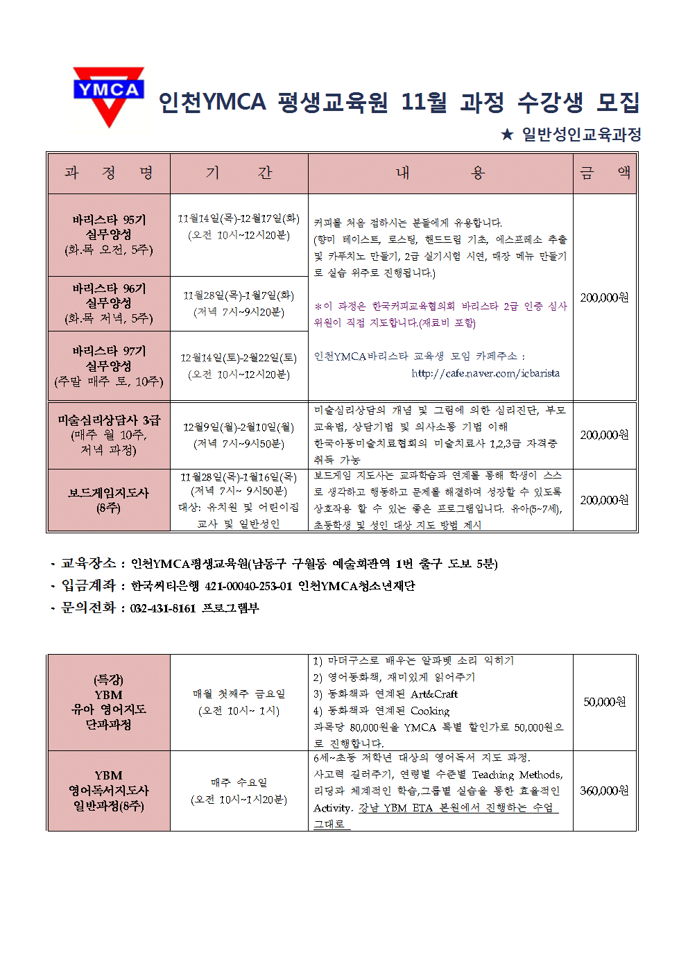 인천YMCA 커피 바리스타 교육 수강생 모집 안내