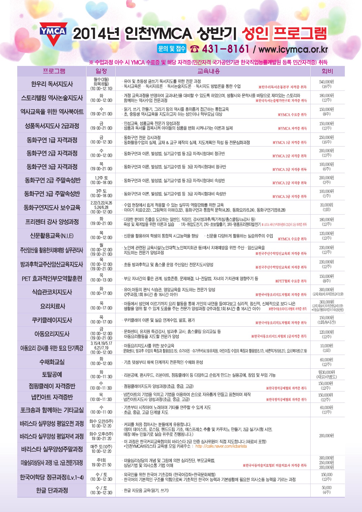 인천 YMCA에서 2014년 상반기 어린이, 성인 프로그램을 진행하고 있습니다.