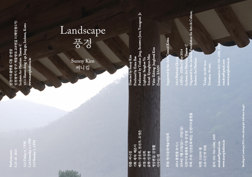 <풍경 Landscape>은 써니킴의 그림 속 풍경을 무대 위에 이미지로 재연(reenactment) 한다. 써니킴의 ‘기억’에 대한 공간은 영화와 소설, 사진과 음악, 그림과 시와 같은 다양한 요소들이 밀접하게 관계하여 만들어진 인위적인 기억의 공간이다. 영화의 한 장면이 정지된 듯 인물들은 과거도 현재도 아닌 허구의 시공간 속에서 각자의 내러티브를 만들어내며 다다를 수 없는 완벽한 이미지를 향해 부유한다. 회화에서 완성되는 작가 특유의 공간감과 빛은 무대 위로 옮겨져 이미지와 텍스트, 그리고 연극적 장치들을 통해 관객의 시선을 의식하며 다시금 이미지와 실재에 대한 질문을 던진다.