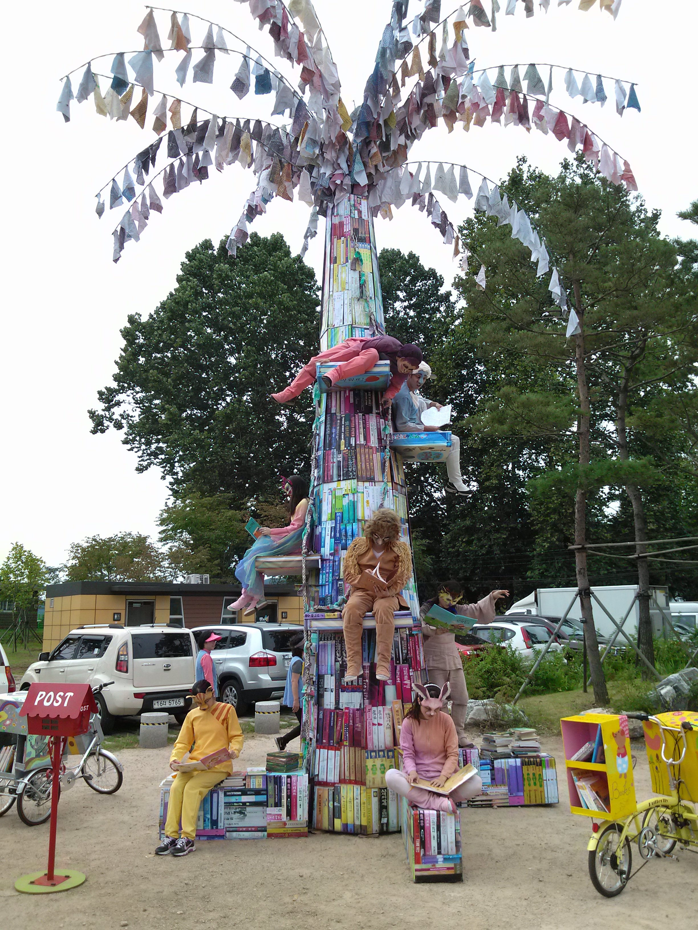 광장에 설치된 책나무, 세계수 世界樹를 도서관 삼아 찾아든 다양한 동물들의 책읽기!!!