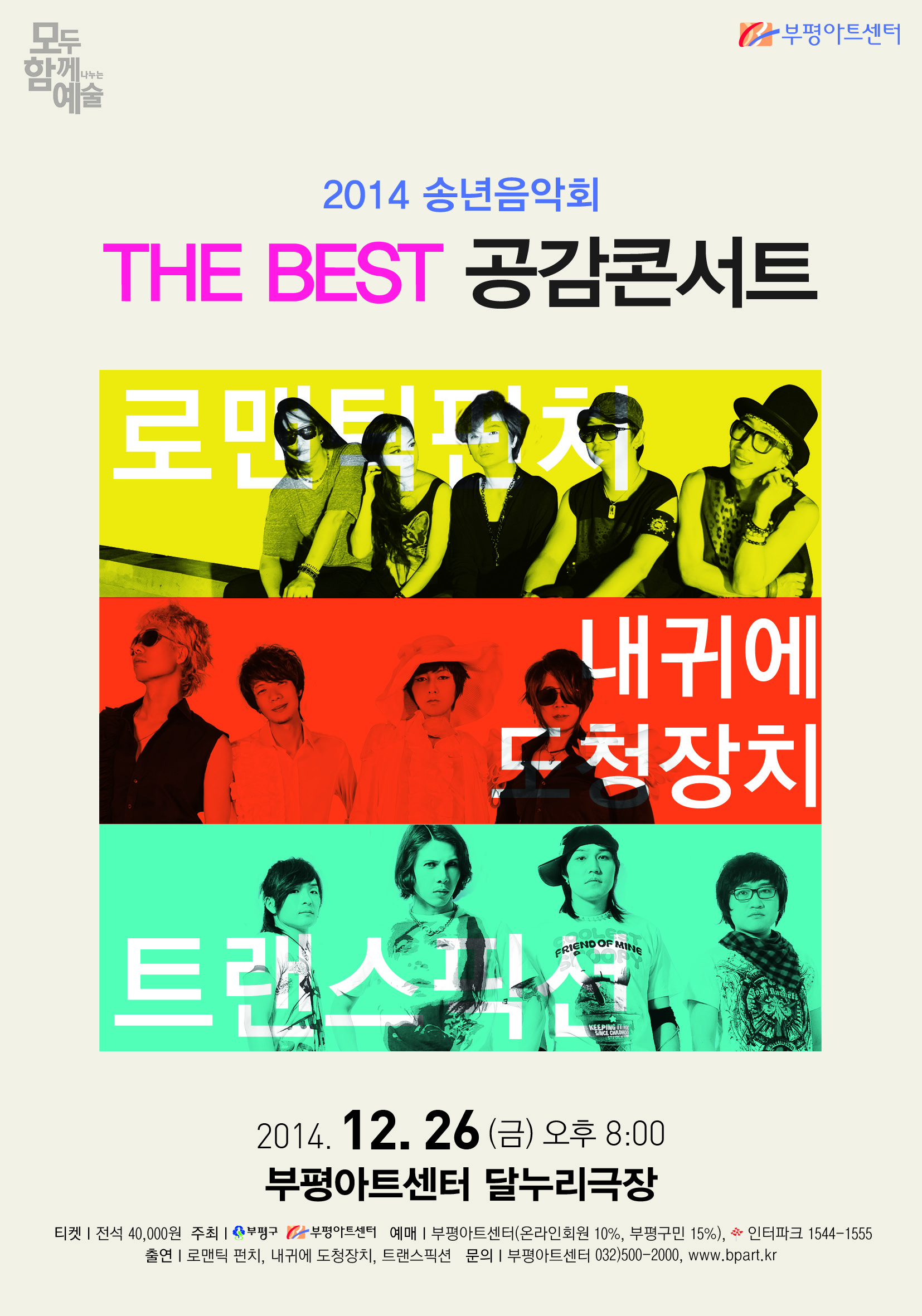 부평아트센터에서 한해를 마무리하는 의미로 <송년음악회 THE BEST_공감콘서트> 시리즈 다섯 번째로 2030세대와 4050세대가 공감하고 즐길 수 있는 공연을 선보입니다. 이번 연은 왁자지껄 거침없는 혼성밴드 ‘로맨틱 펀치’와 몽환과 환타지의 결정체 내 귀에 도청장치, 그리고 국민 월드컵 송 ‘승리를 위하여’의 주인공인 트랜스픽션으로 국가대표급 록큰롤 뮤지션들이 한 무대에서 관객들과 함께 즐길 수 있는 무대가 될 것입니다.