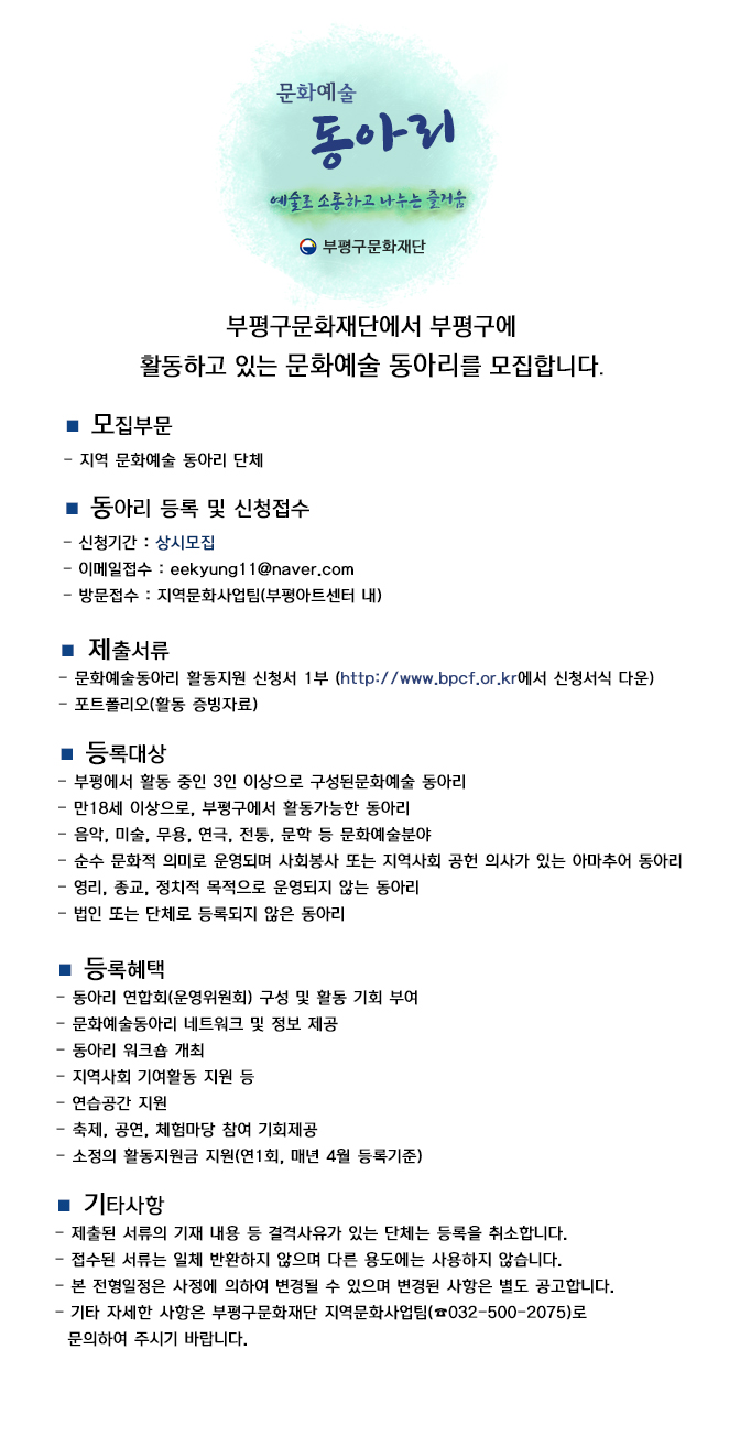 ○ 기타 자세한 사항은 부평구문화재단 지역문화사업팀(☎032-500-2075)로 문의하여 주시기 바랍니다.
