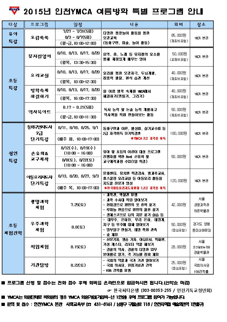 2015년 인천YMCA 여름방학 특별 프로그램 안내