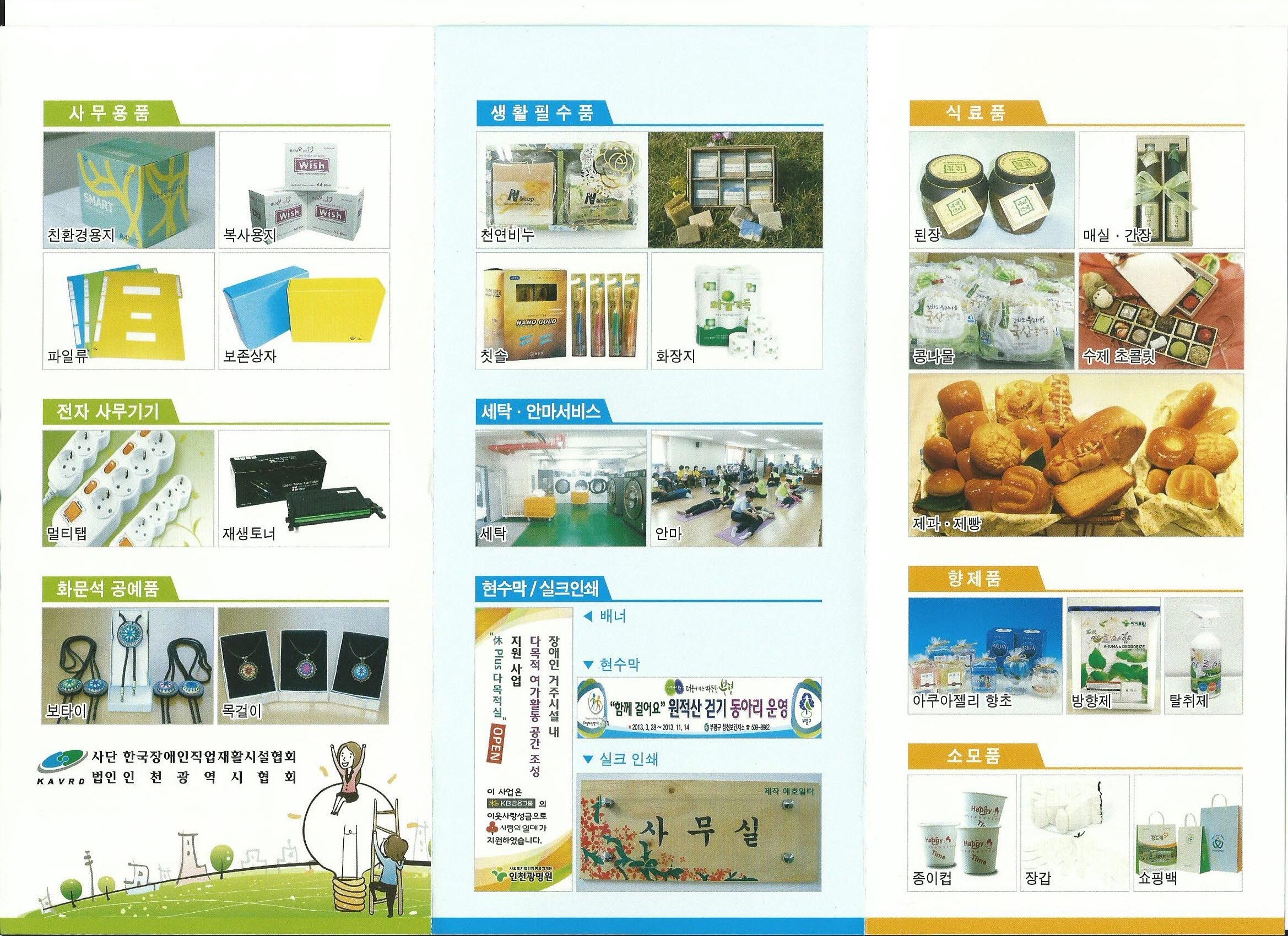 인천장애인직업재활시설 26여 개소에서 생산된 제품으로는 현수막, 복사용지, 칫솔, 카트리지, 정부화일, 보존상자, 두루마리화장지, 점보롤 화장지, 된장, 매실원액, 멀티탭, 경관조명기구, 농산물, 천연비누, 비즈공예, 종이컵, 제과 제빵, 케익, 향초, 화문석 공예품, 실크인쇄 등 다양한 제품들이 장애인에 의해 직접 생산되고 있습니다.