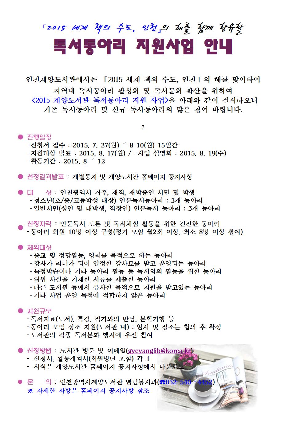 인천계양도서관에서는 ''2015 세계 책의 수도, 인천''의 해를 맞이하여 지역내 독서동아리 활성화 및 독서문화 확산을 위하여 <2015 계양도서관 독서동아리 지원 사업>을 아래와 같이 실시하오니 기존 독서동아리 및 신규 독서동아리의 많은 참여 바랍니다.