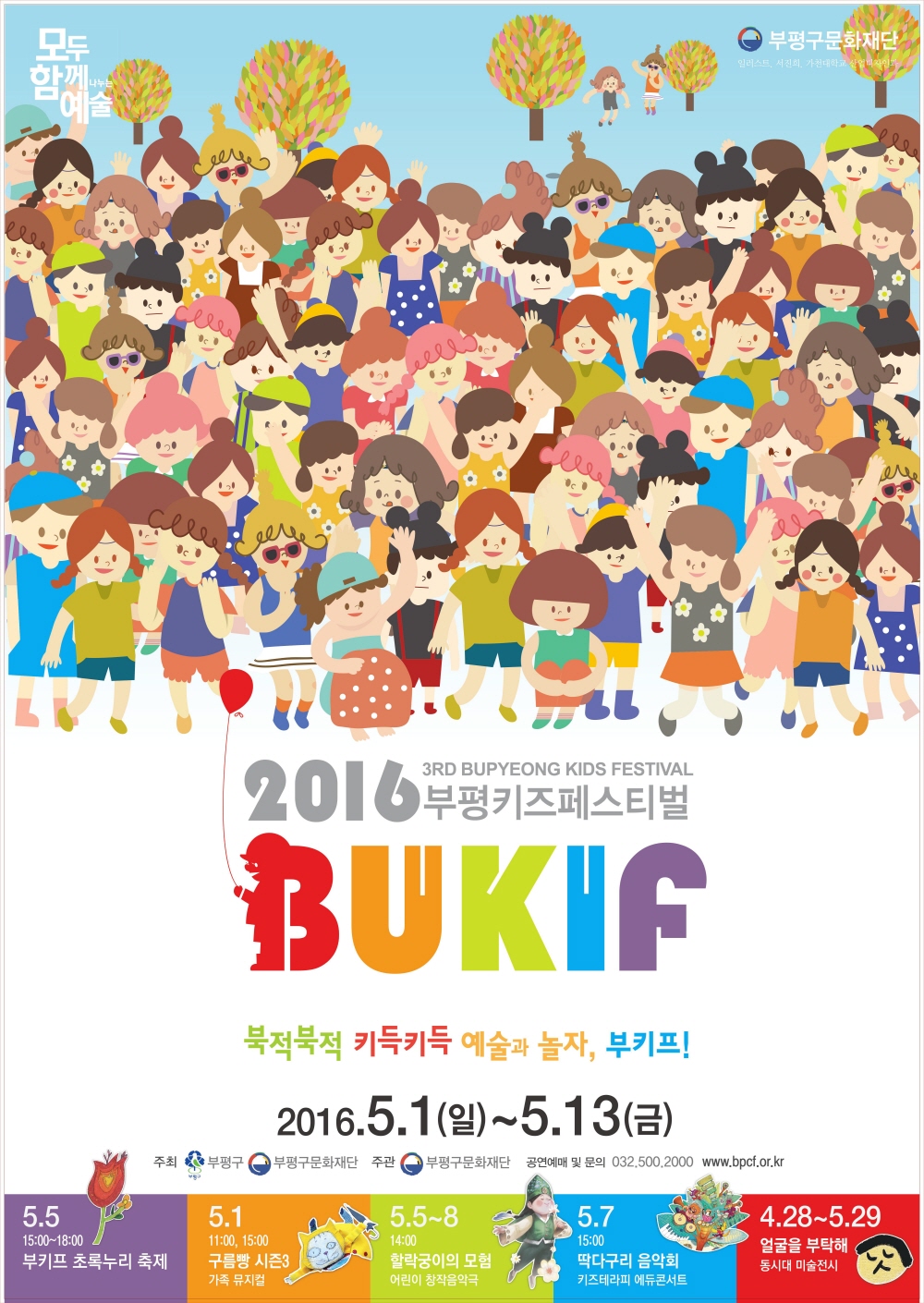 2016 제3회 <부평키즈페스티벌(BUKIF)>은 온​가족이 다함께 참여하는 축제의 장을 만들고자 합니다. 어린이가 가장 행복한 날 5월 5일! 부평구문화재단에서 즐기는 신나는 소풍같은 부키프 초록누리 축제에 여러분을 초대합니다. 어린이 그림 그리기 대회, 체험, 놀이, 장터, 공연, 거리극, 퍼포먼스 등 다양한 야외 무료 프로그램이 준비되어 있습니다.