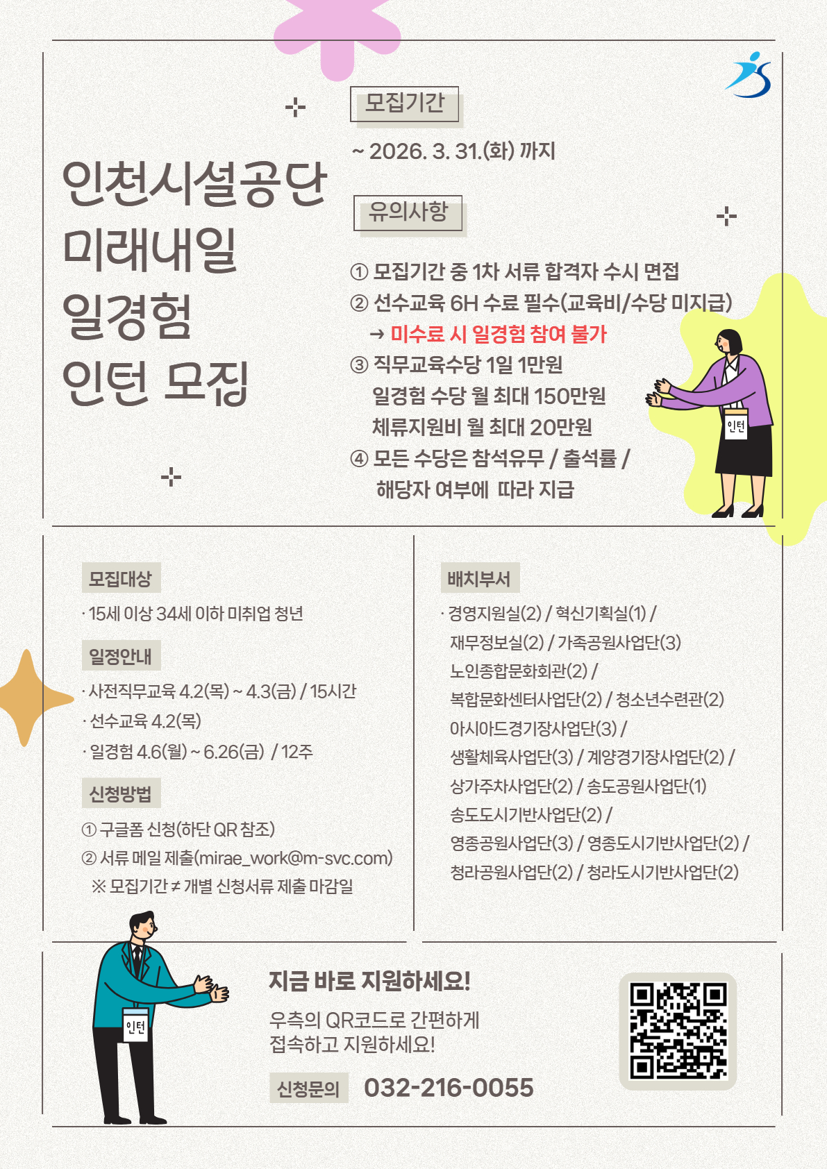 2026년 인천시설공단 미래내일 일경험(인턴형) 채용계획을 붙임과 같이 공고합니다.