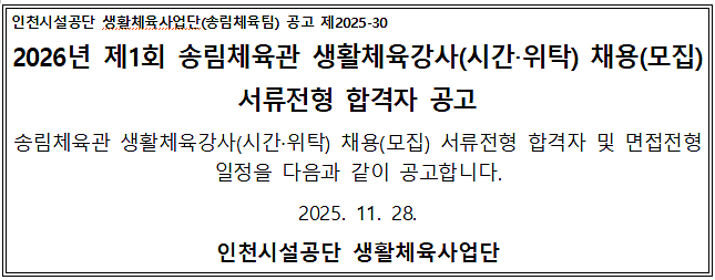 2026년 송림체육관 생활체육강사(시간,위탁) 채용(모집) 서류전형 합격자 공고