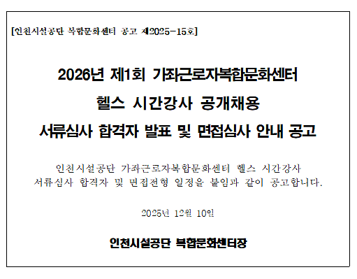 2026년 제1회 가좌근로자복합문화센터 헬스 시간강사 공개채용 서류심사 합격자 발표 및 면접심사 안내 공고