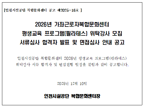2026년 가좌근로자복합문화센터 평생교육 프로그램(필라테스) 위탁강사 모집 서류심사 합격자 발표 및 면접심사 안내 공고