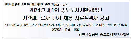 2026년도 제1회 송도도시기반사업단 기간제근로자 채용 서류심사 합격자 발표 및 면접전형 공고