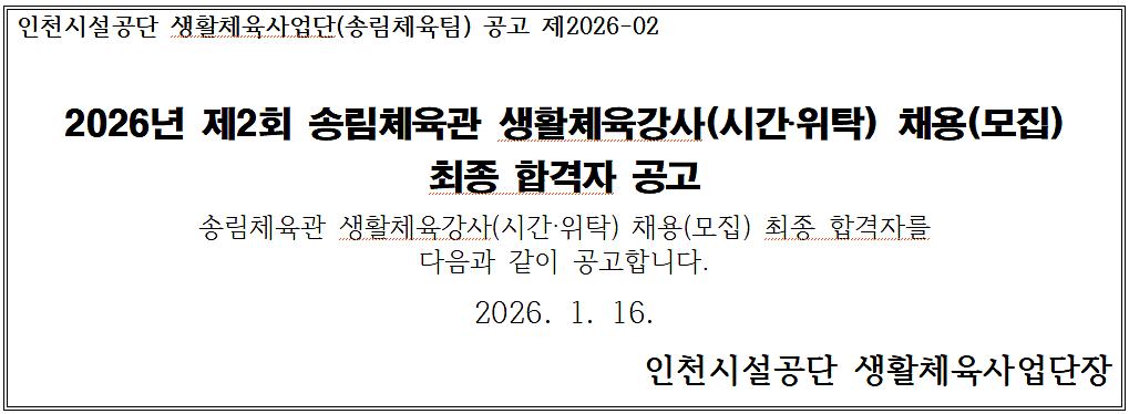 2026년 제2회 송림체육관 생활체육강사(시간,위탁) 채용(모집) 최종합격자 공고