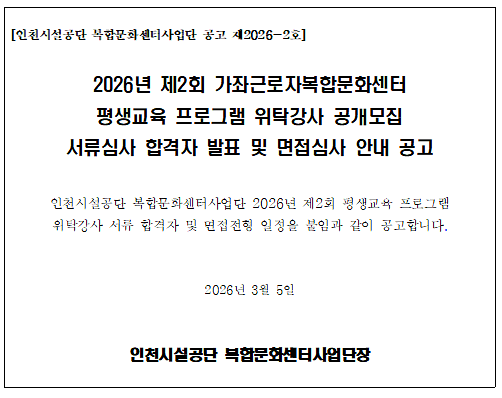 2026년 제2회 가좌근로자복합문화센터 평생교육 프로그램 위탁강사 공개모집 서류심사 합격자 발표 및 면접심사 안내 공고