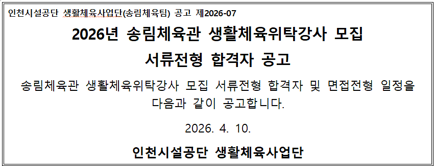 2026년 송림체육관 생활체육위탁강사 모집 서류전형 합격자 공고