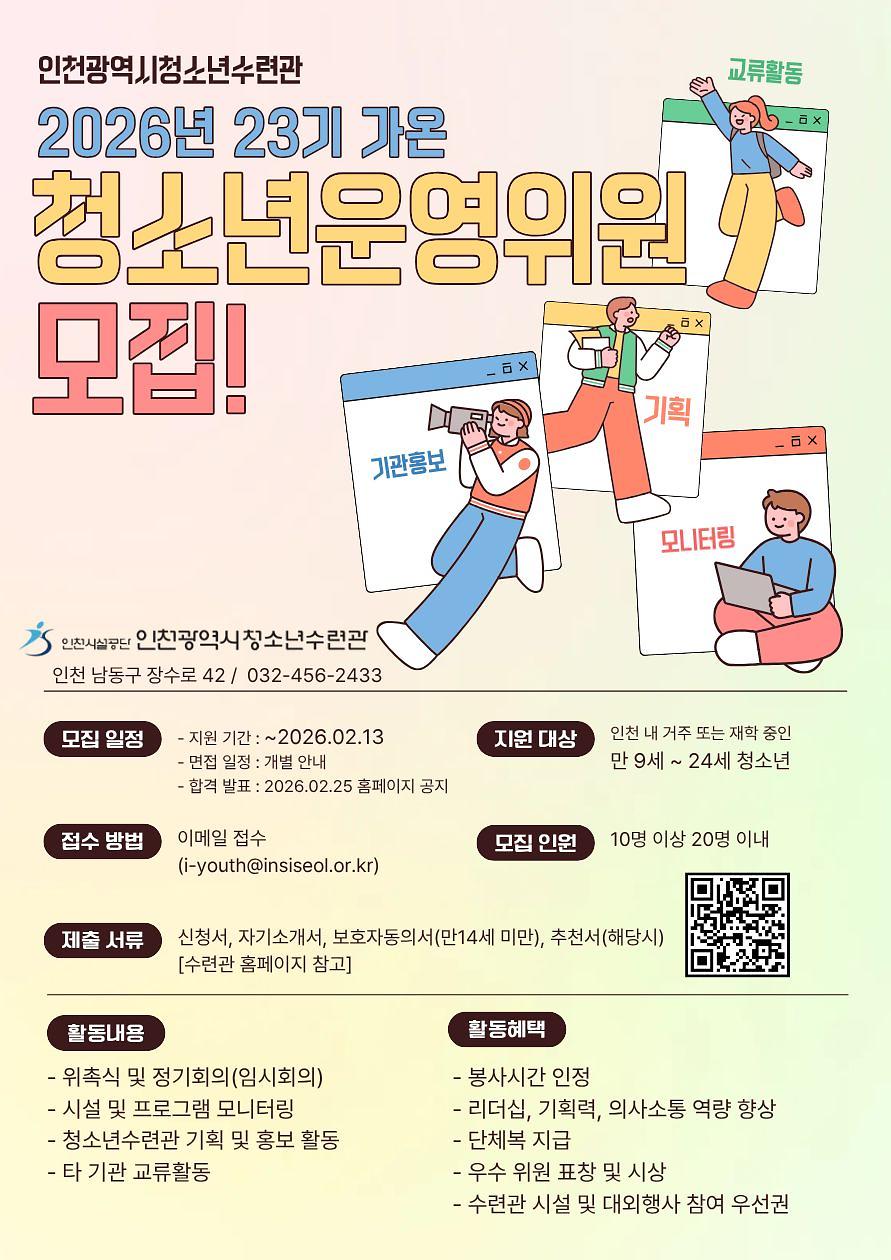 인천광역시청소년수련관에서 23기 청소년운영위원회를 모집합니다.(~2/13까지 모집기한연장)