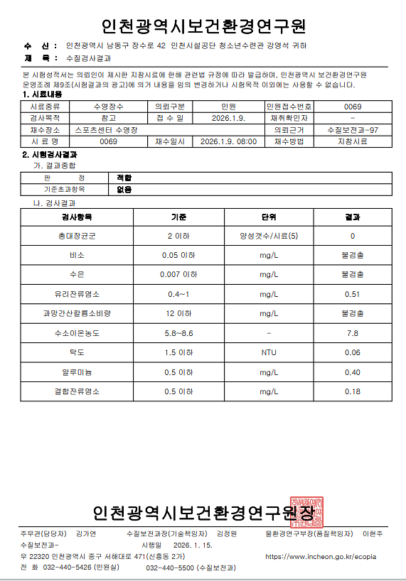 2026년 1월 청소년수련관 수영장수 수질검사 결과