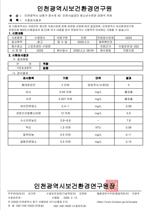 2026년 2월 청소년수련관 수영장수 수질검사 결과