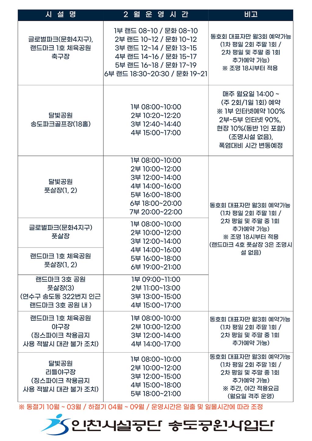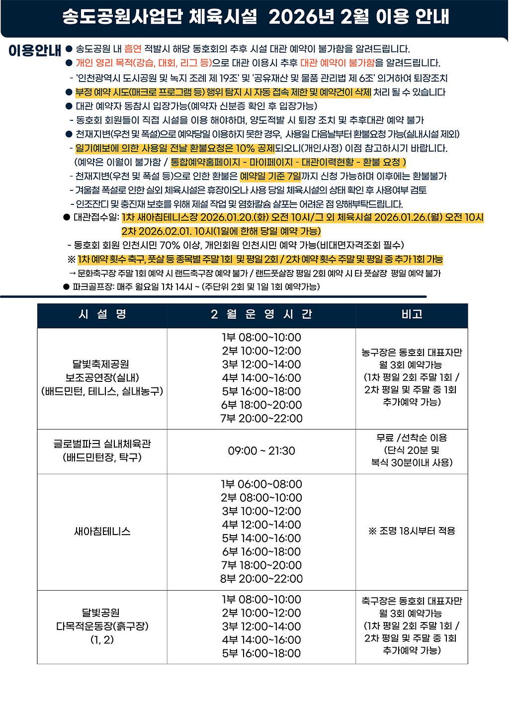 2026년 2월 송도공원내 체육시설 이용안내 및 리틀야구장 예약변경 안내