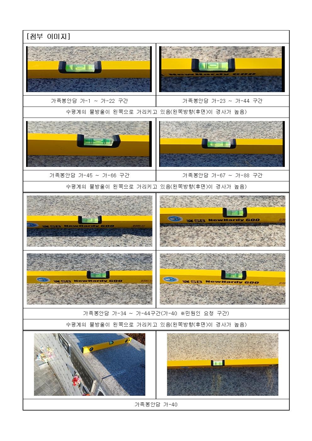 그 결과, 봉안담 가형 상판 전체가 전면으로 2~5mm 기울어짐이 확인되었으며, 이는 기술적 검토를 통해 도출된 사실임을 다시 한번 말씀드립니다. 본 결과는 민원인의 의견을 묵살 또는 왜곡한 것이 아님을 알려드립니다.