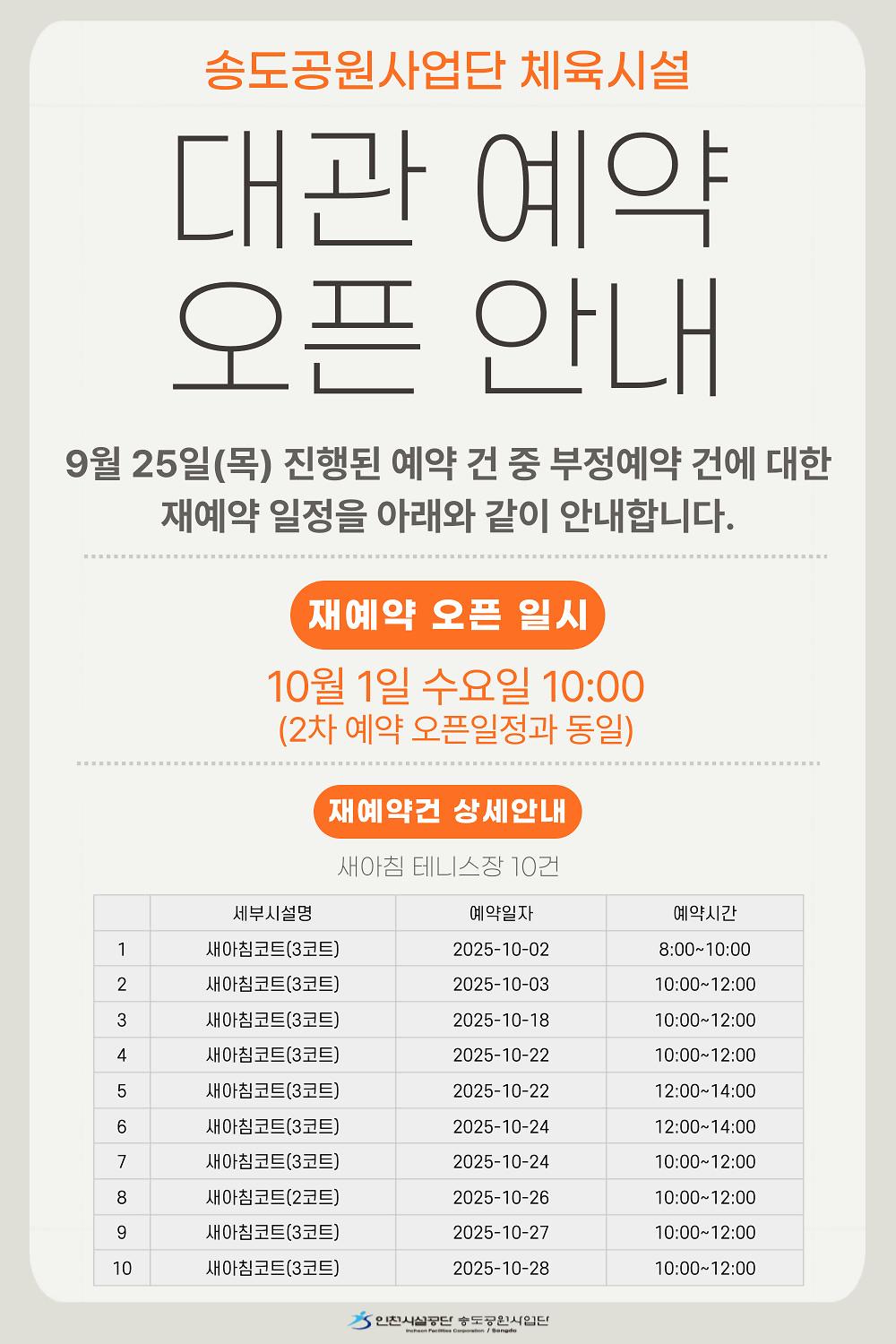 송도공원 새아침테니스장 대관(10월분) 재예약 정정 안내