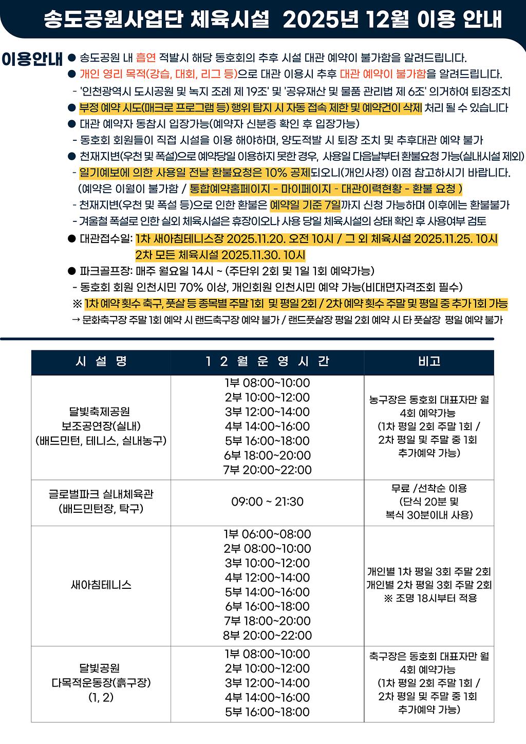 2025년 12월 송도공원 체육시설 예약 변경 안내